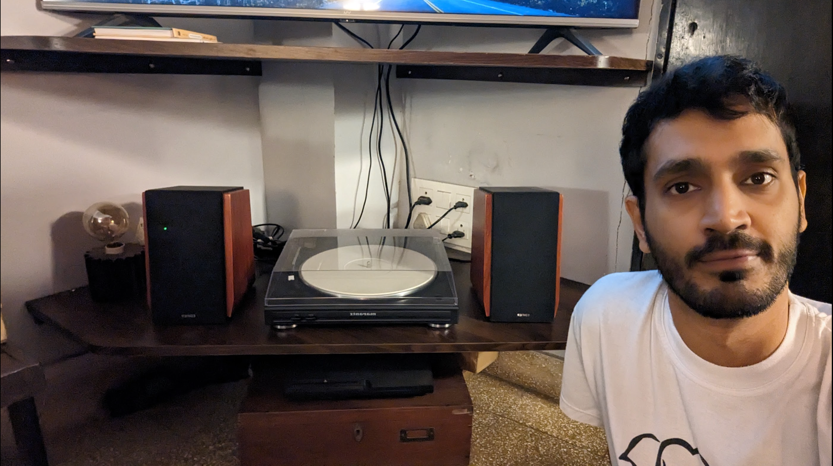 Its a Marantz TT 5005 paired with active speaker set of an Edifier 1700DB. I have these set up under my TV, with the speakers doubling up as TV speakers to listen to other music sources too